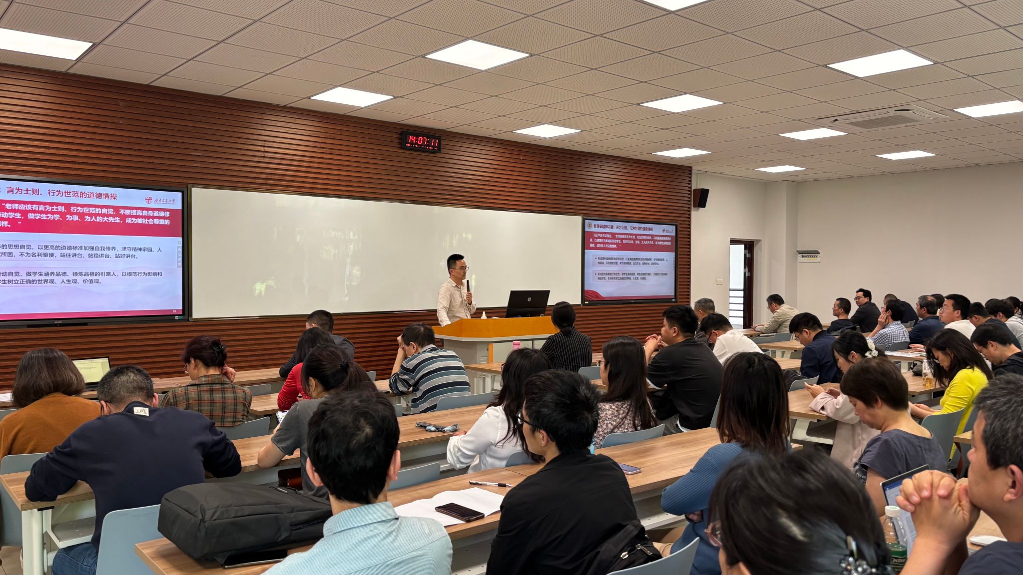 2025-04-264月24日下午,成人直播 在犀浦校区X1201召开全体教职工大会暨师德师风教育宣讲会。会议由党委书记黄春蓉主持,学院全体教职工参加了会议。...
