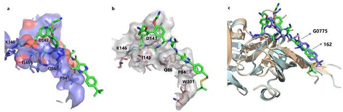 图3 (a)G0775和LepB(大肠杆菌的SPase I)复合物晶体结构(PDB:6B88);(b)通过分子对接预测的162与LepB的结合模式;(c)通过分子对接预测的162与LepB的结合模式与6B88的叠加构象