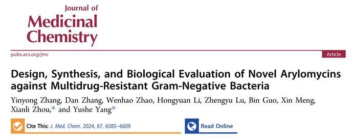 为第一单位,以“Design, Synthesis, and Biological Evaluation of Novel Arylomycins against Multidrug-Resistant Gram-Negative Bacteria”为题,发表在药物化学顶级期刊《Journal of Medicinal Chemistry》上,论文第一作者为周先礼教授指导的博士研究生张银勇,通讯作者为成人直播