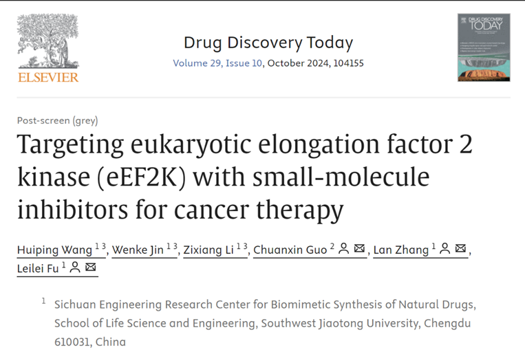 符雷蕾团队在美国药学权威期刊Drug Discovery Today上发表了一篇题为“Targeting eukaryotic elongation factor 2 kinase (eEF2K) with small-molecule inhibitors for cancer therapy”综述(//doi.org/10.1016/j.drudis.2024.104155. 影响因子:6.5)。这篇综述总结了eEF2K 的分子结构及其在癌症中的致癌作用,包括血管生成、肿瘤细胞迁移、增殖、存活和上皮-间质转化(EMT),同时进一步讨论了针对eEF2K的小分子化合物的现状,包括单靶点、双靶点小分子化合物以及新出现的联合治疗策略,以期为肿瘤治疗提供新思路。论文第一作者为成人直播