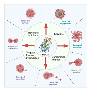 真核细胞延伸因子2激酶(eEF2K)是由钙/钙调素激活的α-激酶家族的成员。作为翻译的关键调节因子,eEF2K 可使 eEF2 在其成熟多肽的 Thr56 氨基酸残基上磷酸化,从而降低其对核糖体的亲和力,抑制蛋白质合成的延长。值得注意的是,eEF2K在恶性细胞中经常高度过表达。eEF2K 对肿瘤细胞的许多细胞过程至关重要,包括调节自噬活性和细胞 ATP 水平、血管生成、肿瘤细胞迁移、增殖、存活和上皮-间质转化(EMT)。因此,eEF2K 被认为是抗癌治疗的有效靶点。