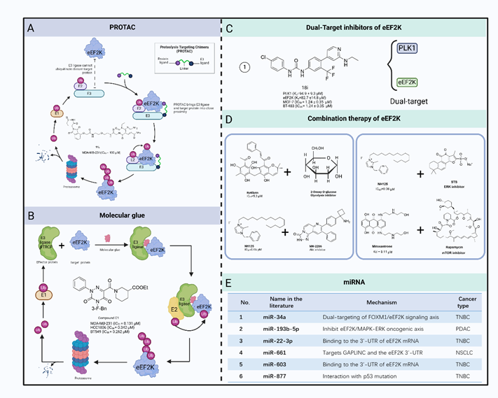 更重要的是,随着包括 PROTAC 和基因编辑在内的越来越多的新技术被应用于药物开发,人们有机会发现更具特异性和效力的eEF2K小分子抑制剂,作为未来的癌症治疗药物。由于肿瘤发生过程受到多种因素的影响,只针对一种因素很可能无法遏制癌症的发展。因此,针对一种以上的癌症相关因素进行综合治疗似乎可以达到控制癌症的目的。