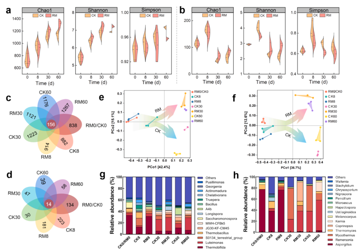 针对上述技术瓶颈,本研究利用具有高比表面积、丰富的空隙结构的生物炭搭载功能微生物,构建耐受性强且代谢活性高的外源微生物-生物炭添加剂,系统研究其对对堆肥过程中氮素转化与腐殖酸合成的调控机制。结果表明,生物炭载菌处理通过富集Longispora和Coprinopsis等氮转化微生物,重构堆肥体系细菌-真菌互作网络,简化氮代谢层级调控关系并增强微生物协同效应,促进氨基酸态氮等腐殖质前体的积累,驱动腐殖酸的聚合进程,使得堆肥产品中总氮保留率与腐殖质含量分别提高22.27%和77.46%,同步实现氮素资源化与腐殖质品质提升。本研究阐明了生物炭-微生物协同调控氮素定向转化与腐殖化的机制,为破解堆肥氮素保留效率低、腐殖化进程缓慢等难题提供了兼具理论创新性与工程可行性的强化策略。