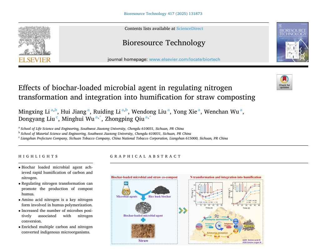 邱忠平教授团队的研究成果“Effects of biochar-loaded microbial agent in regulating nitrogen transformation and integration into humification for straw composting”,论文第一作者为2021级博士研究生李明星,通讯作者为吴明蔧老师和邱忠平教授,成人直播