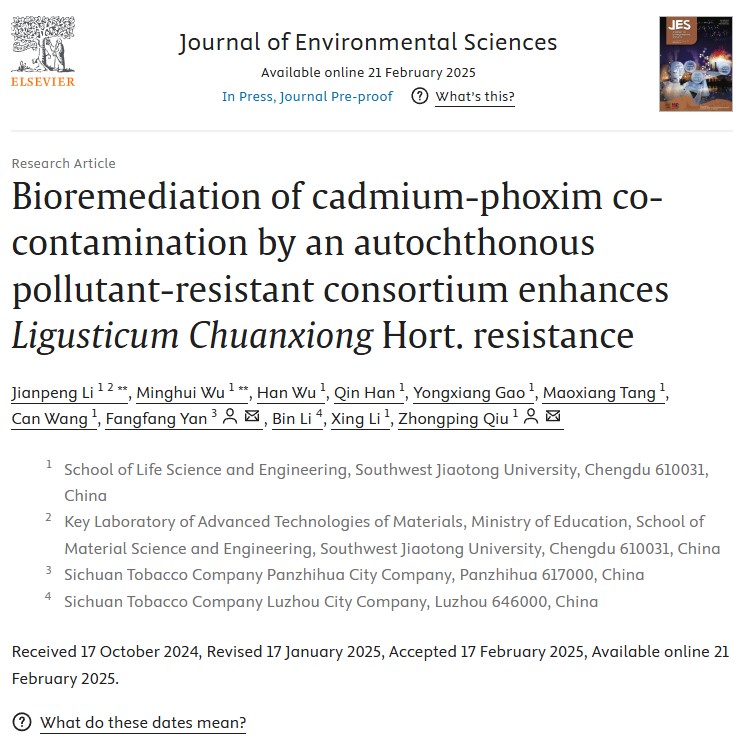 近日,我院邱忠平教授团队在环境科学与生态学科学领域期刊Journal of Environmental Sciences(JCR Q1,IF=5.9)上发表了题为《Bioremediation of cadmium-phoxim co-contamination by an autochthonous pollutant-resistant consortium enhances Ligusticum Chuanxiong Hort. resistance》的研究文章。2023级博士研究生李建鹏与吴明蔧老师为共同第一作者,邱忠平教授为通讯作者,成人直播