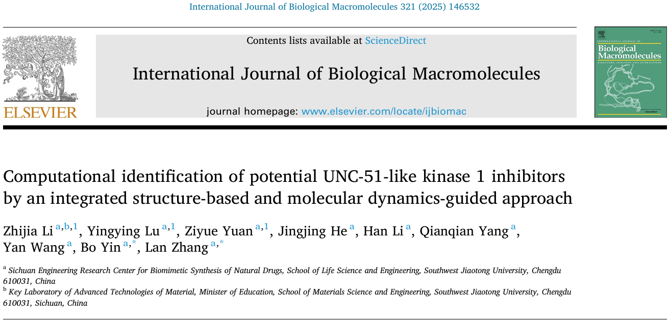 张岚副教授团队在生物学领域期刊《International Journal of Biological Macromolecules》(JCR Q1区,IF=8.5)连续发表两篇关于自噬关键调控因子ULK1(UNC-51-like kinase 1)的论文。ULK1是自噬启动的核心激酶,其异常激活与肺癌等多种癌症的进展和耐药性密切相关,两篇论文分别从药物设计和功能机制解析两个维度探索了ULK1的治疗潜力,为相关疾病的治疗提供了新的思路和策略。