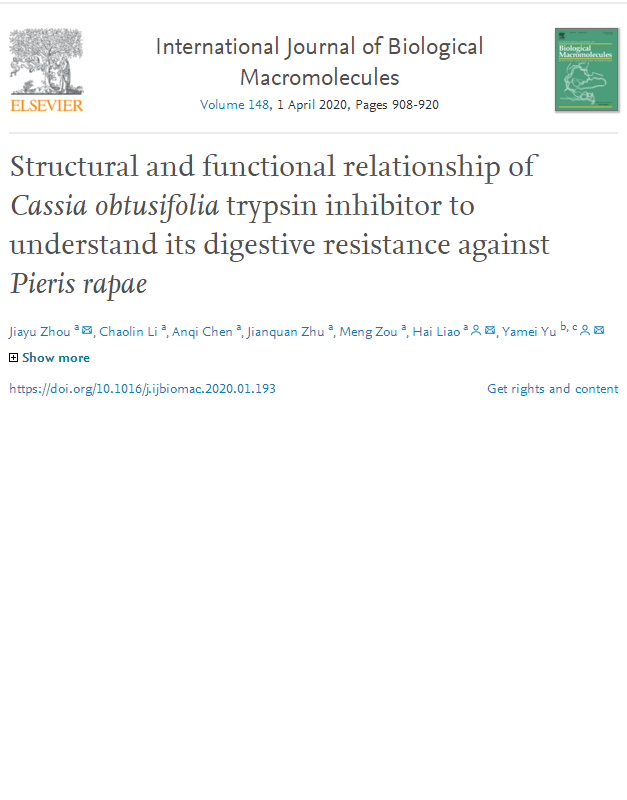 “药用植物资源与分子生物学实验室”在国际刊物International Journal of Biological Macromolecules(IF4.784,JCR一区)在线发表文章“Structural and functional relationship of Cassia obtusifolia trypsin inhibitor to understand its digestive resistance against Pieris rapae”。 该文在撰写过程中得到了清华大学隋森芳教授(成人直播