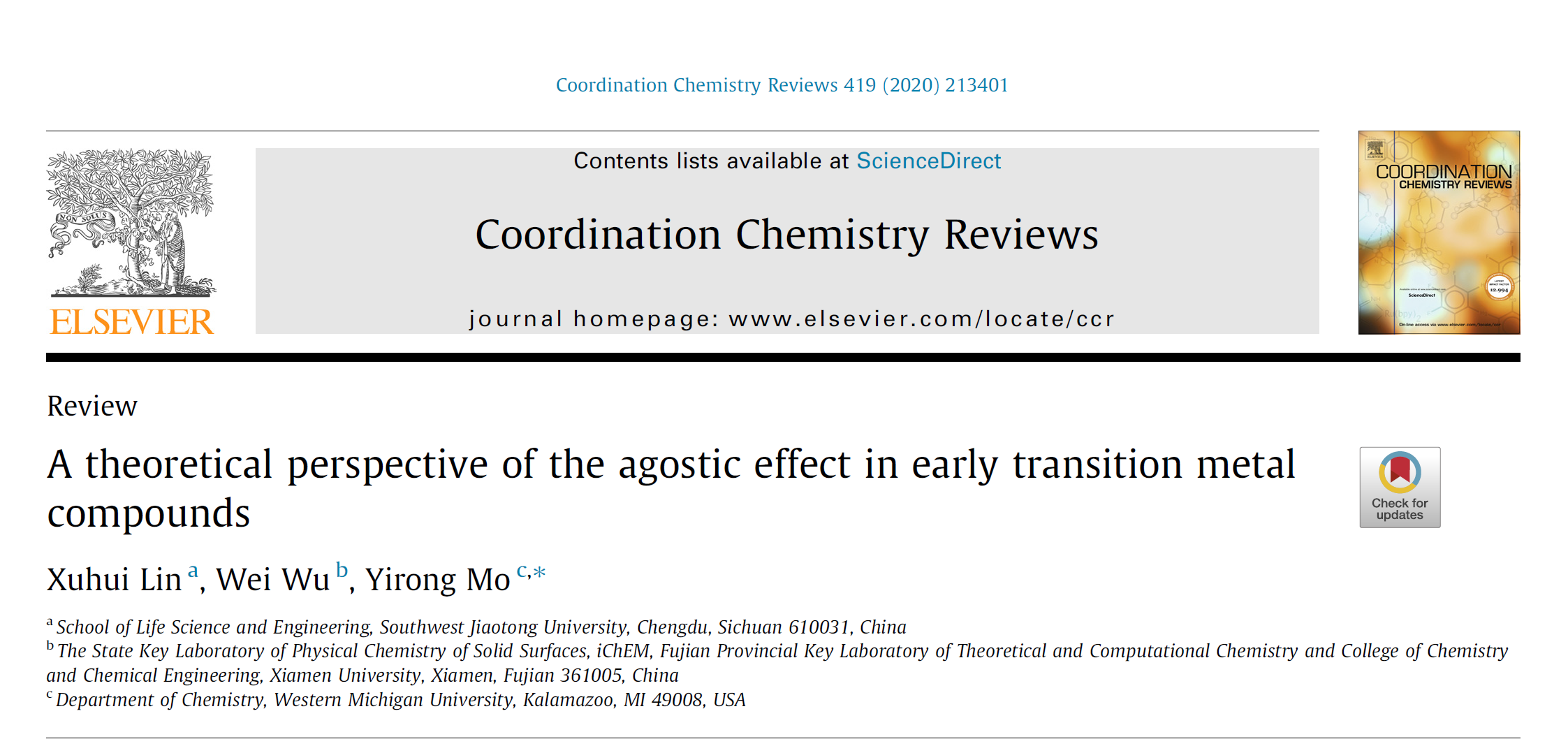 林旭辉老师以我院为第一单位在配位化学领域相关期刊《Coordination Chemistry Reviews》 (IF=15.367, 中科院一区TOP期刊) 上发表了题为“A theoretical perspective of the agostic effect in early transition metal compounds”的综述论文,论文回顾了过渡金属抓氢键(Agostic Bond)的发展与研究历程,特别是理论计算方法对其成键本质的研究。