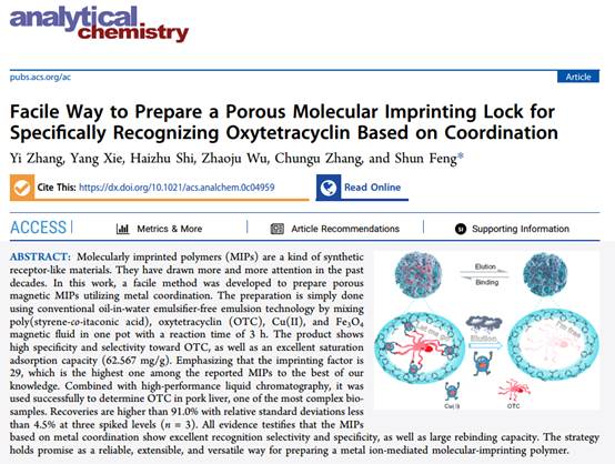 分子印迹聚合物(MIPs)是一种“塑料”抗体,具有优秀的分子识别能力。但存在制备方法复杂、特异性不足、印迹效率和传质速率较低等问题。针对此问题,封顺教授团队发展了一种基于金属配位法的快速简便制备磁性多孔MIPs(Cu-mMIPs)的新策略。仅需将功能单体、磁流体、土霉素(OTC)与Cu(II)混合,“一锅”即可制得。在其中Cu(II)同时扮演着“桥”基和导向官能团的角色,使得MIPs的印迹因子超过传统方法近10倍。依靠MIPs特殊三维空穴的空间识别能力和IMAC金属-杂原子间特异配位作用两种亲和力,Cu-mMIPs对OTC表现极佳的识别能力。结合常规液相色谱-紫外可见检测器,即可实现对猪肝这一复杂生物样本中痕量OTC的准确测定。该策略为发展具有高效率、高选择性、高结合容量、高传质速率和高稳定性的MIPs提供了一条新的合成路径。