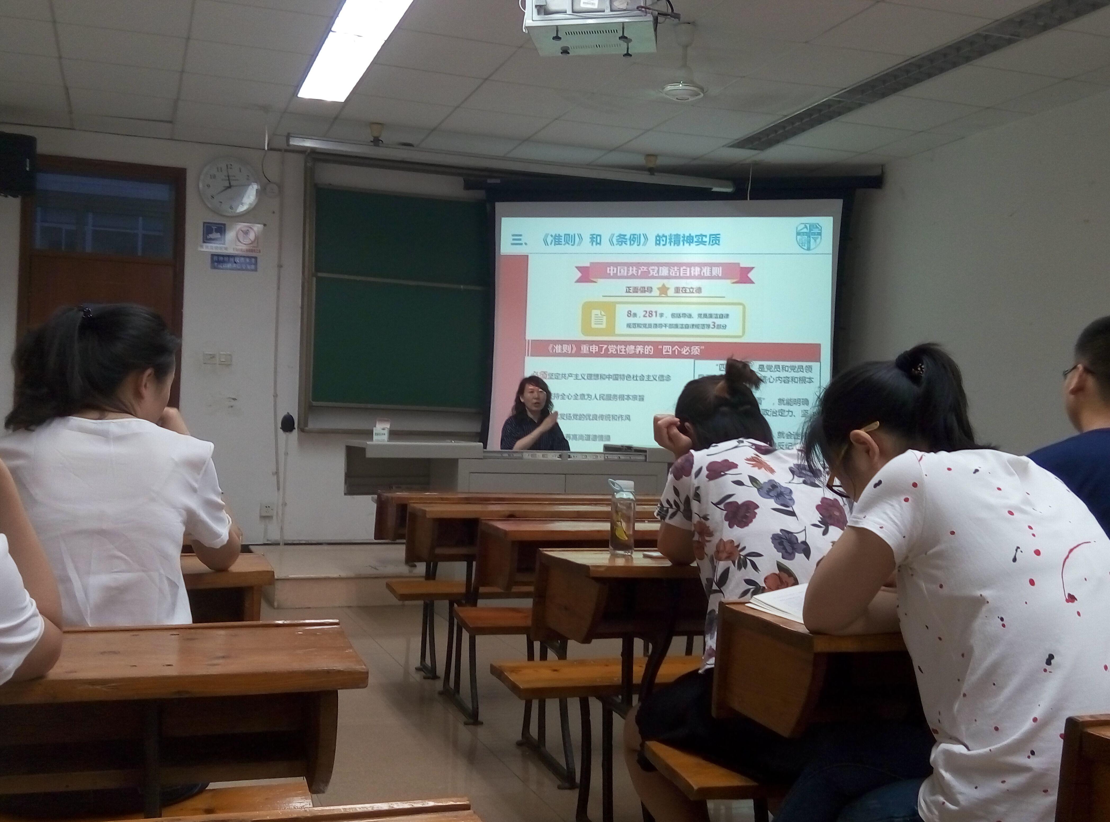 本次贺妍老师讲党课的主题是《坚持高标准,守住底线,推进全面从严治党》,讲课开始贺妍老师再次强调“两学一做”学习教育的重大意义。随后又重点讲解了《中国共产党廉洁自律准则》(《准则》)和《中国共产党纪律处分条例》(《条例》)的主要内容、修订《准则》和《条例》的重要意义和基本原则、《准则》和《条例》的精神实质以及相关事例的解读及运用等。她强调,全体党员必须按照《准则》的“高线”要求和《条例》的“底线”规定,严格要求自己、强化党性观念、贯彻落实好《准则》和《条例》。一个小时的党课内容信息量大、思路严谨、案例丰富,贺妍老师深入浅出的解读让支部全体党员获益匪浅,在更加深入了解和掌握《准则》、《条例》的同时进一步坚定了理想信念、强化了党纪观念。