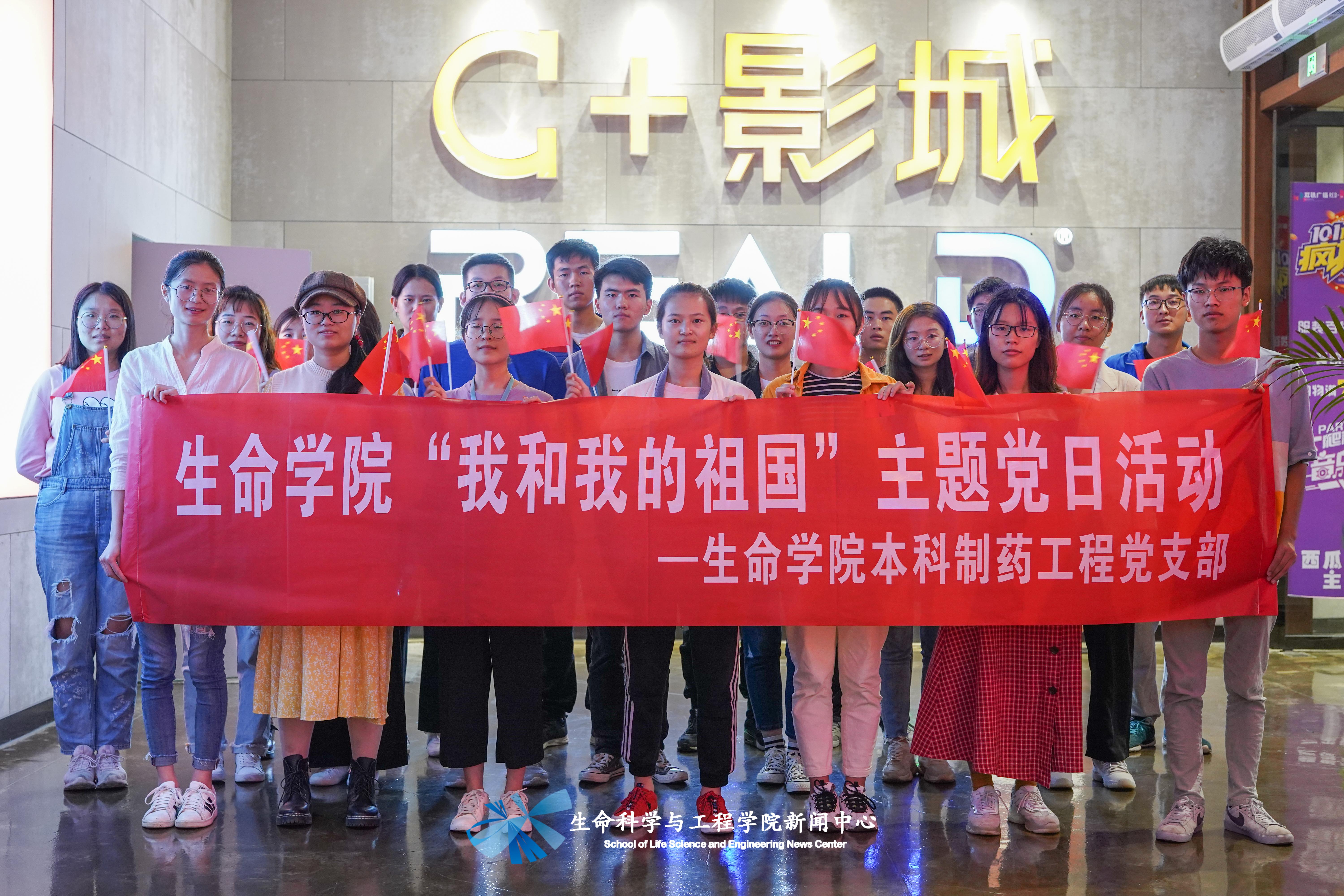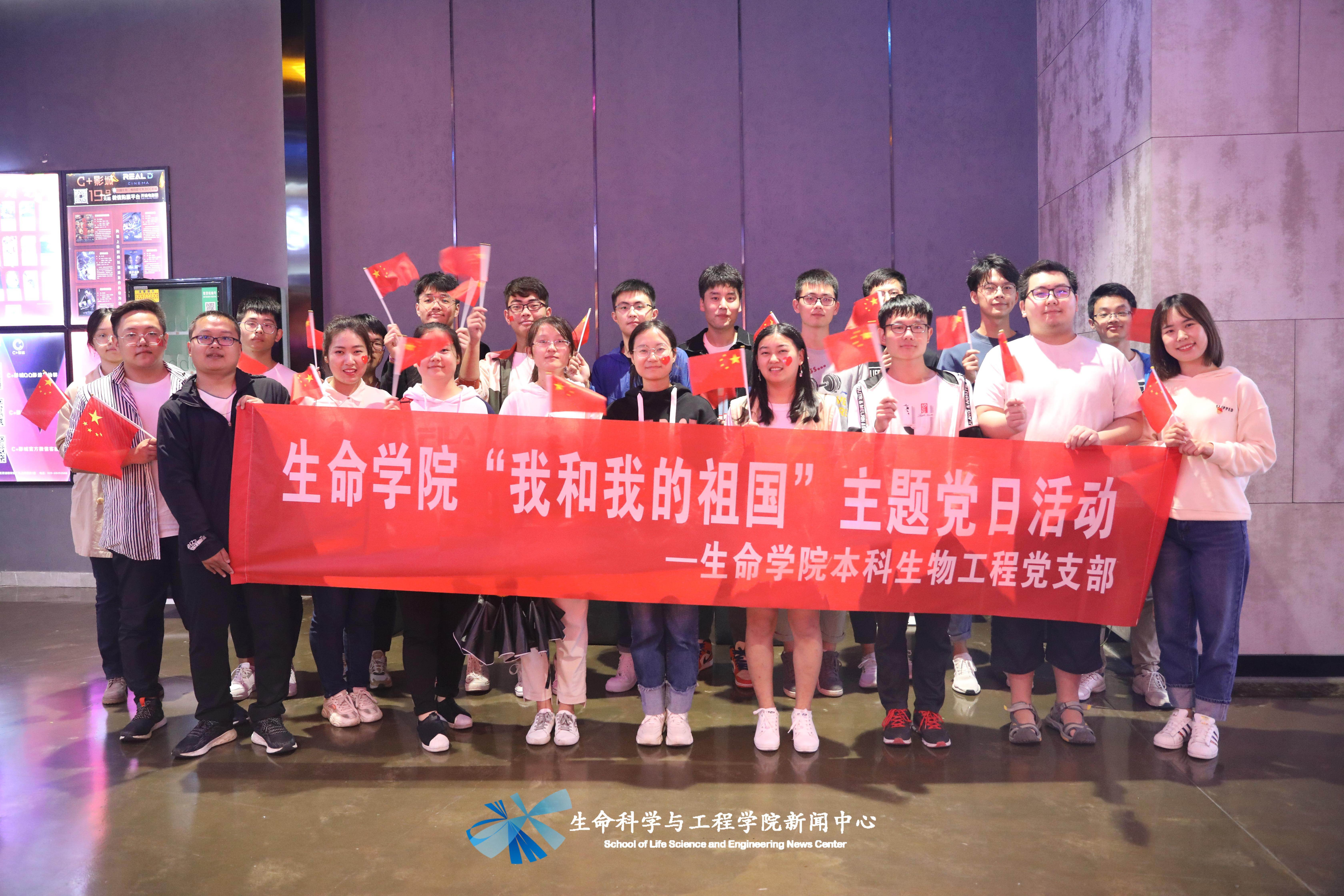 下午14:00,在犀浦校区C+影城,党支部以观看爱国主题电影《我和我的祖国》为主要学习形式,进行主题党日活动。观影前,党支部以拍摄照片和录制视频形式,记录了党支部成员的爱国热情和对祖国最真挚的爱意与祝福。