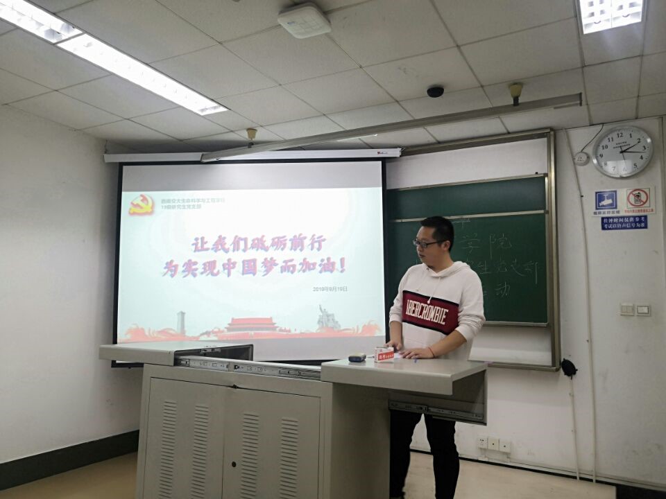 2019级研究生党支部开展了“庆中华人民共和国70周年,砥砺共筑中国梦”主题教育活动,活动在J4305a教室展开,全体成人直播