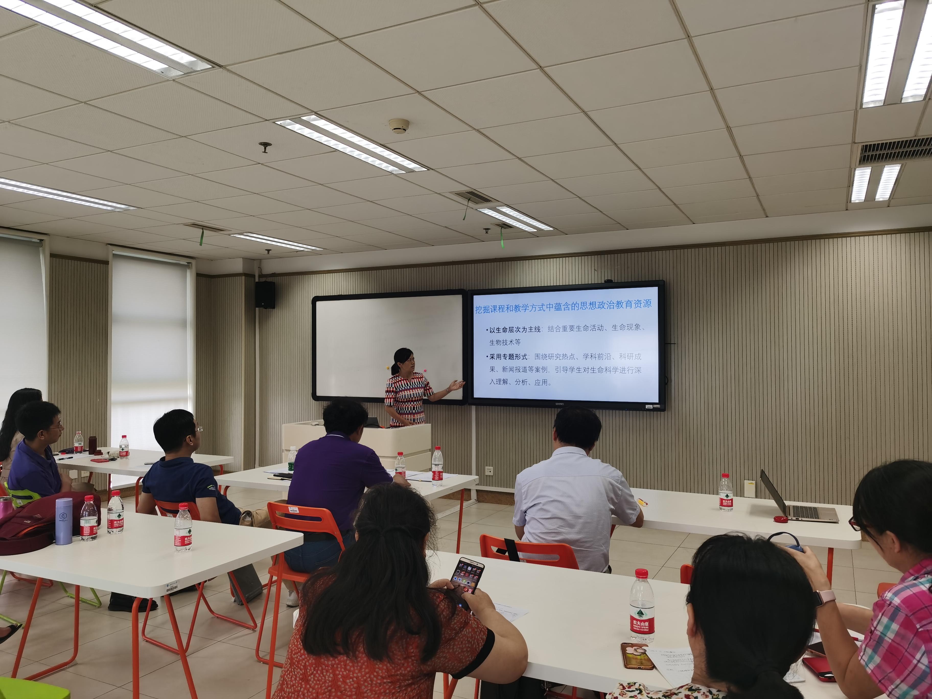 徐柳老师分享的主题是“《基础生命科学》课程的思政教育探索与实践”。她以生命层次为主线,结合重要生命活动、生命现象、生物技术,围绕研究热点、学科前沿、科研成果、新闻报道等案例选取主题,引导学生对生命科学进行深入理解、分析和应用。同时结合人类历史上的瘟疫流行史和新冠疫情,进行爱国主义、文化自信和使命教育。