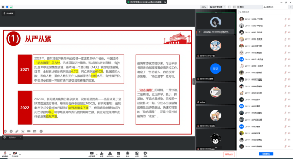 最后,同学们对今天学习的内容展开了热烈的讨论,并由高鹏老师做出最后的总结,希望党员同志们认真学习,提高疫情防控意识,以自身行动践行疫情防控不松懈,守土有责勇担当,同时要树立正确的理想信念、学会正确的思维方法,分析和分辨社会上的不良信息,能够直面各种错误观点,自觉把个人的理想追求融入国家和民族的事业中,勇做走在时代前列的奋进者、开拓者。同学们纷纷表示自己会将防控疫情谨记于心,携手同心,共守校园。