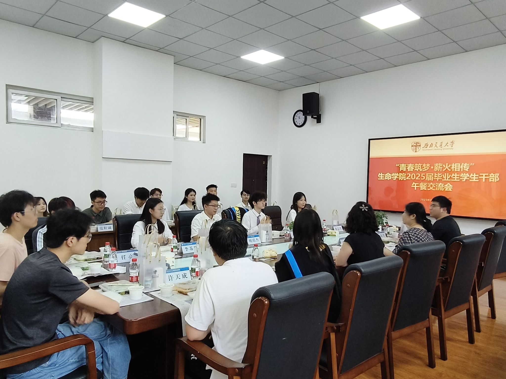 在轻松愉悦的午餐氛围中,师生围坐畅谈,餐盘里盛满的不仅是美味午餐,更是学院对2025届毕业生们的殷切祝福。毕业生学生干部们敞开心扉,将这场聚会变成了一场别开生面的"青春梦想分享会"。大家纷纷分享了自己的职业规划和人生理想,团建中心徐同学结合自身在苏州医疗产业的实习经历,向同学们发出邀请:"苏州生物医药产业园已形成完整产业链,期待与更多校友在长三角地区共同发展。"即将赴四川大学深造的杨同学则表达了对科研的热忱:"合成生物学领域充满无限可能,希望能与志同道合的伙伴一起探索生命科学的奥秘。"青年志愿者协会陈同学从行业视角分享了对生物医药领域发展的见解;学生事务中心方同学结合就业经历,鼓励同学们:"生物医药是国家重点发展领域,坚持专业深耕必将收获成长。"学生融媒体中心李同学、学生会董同学等学生骨干也分享了各自的毕业去向,并相约未来在各自城市再聚首。