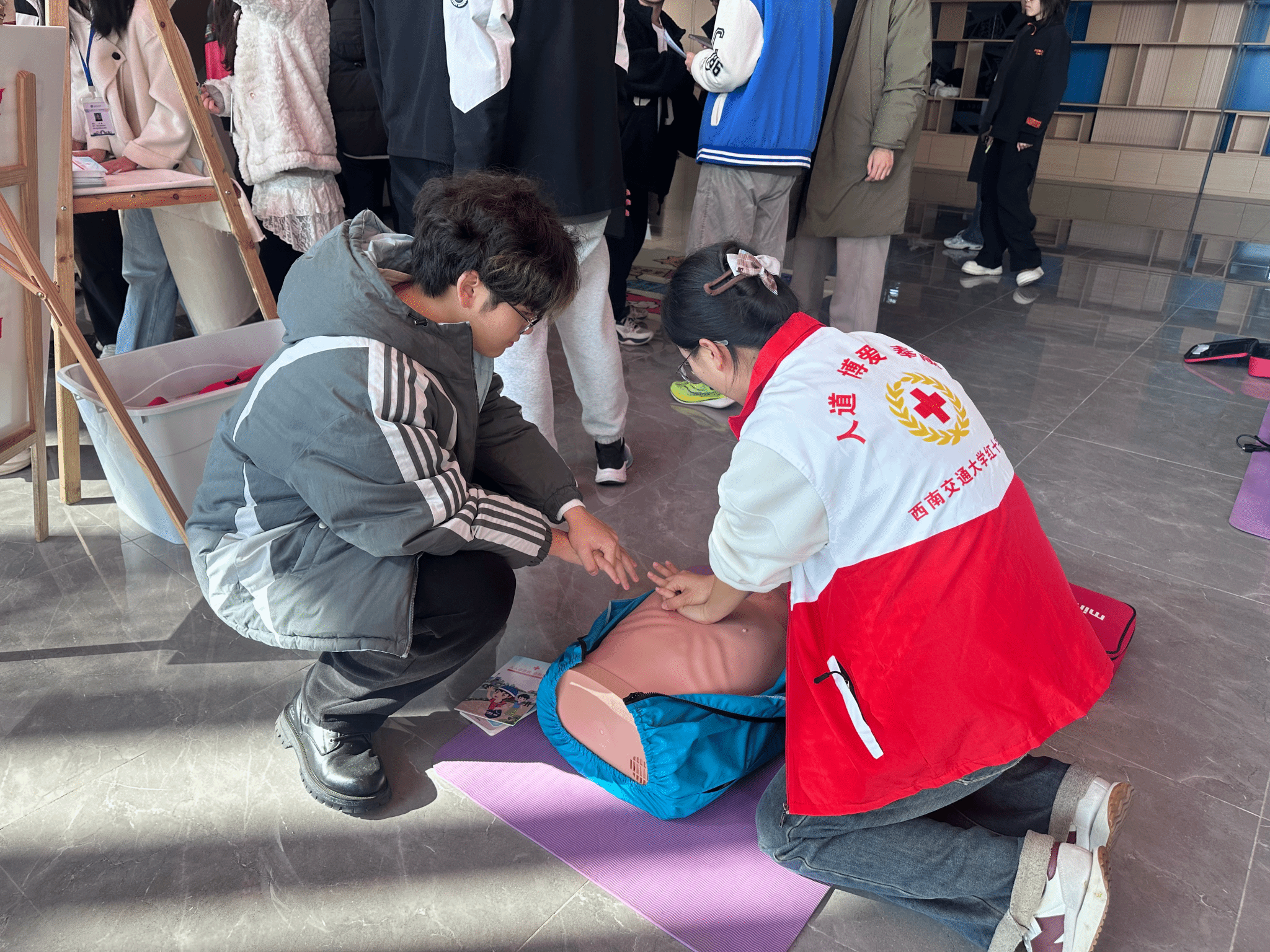 为使知识真正转化为可用的技能,活动特别设置了实践环节。在学院“融通共育”成果展现场专门设立“健康知识加油站”互动环节,同学们不仅通过趣味问答巩固了理论学习,更在校红十字会志愿者的指导下进行了“一对一”的急救技能实操。志愿者借助模拟人教具,对同学们的按压位置、深度、频率及手法进行了细致教学与个性化指导,有效帮助大家跨越了从“知道”到“做到”的壁垒。