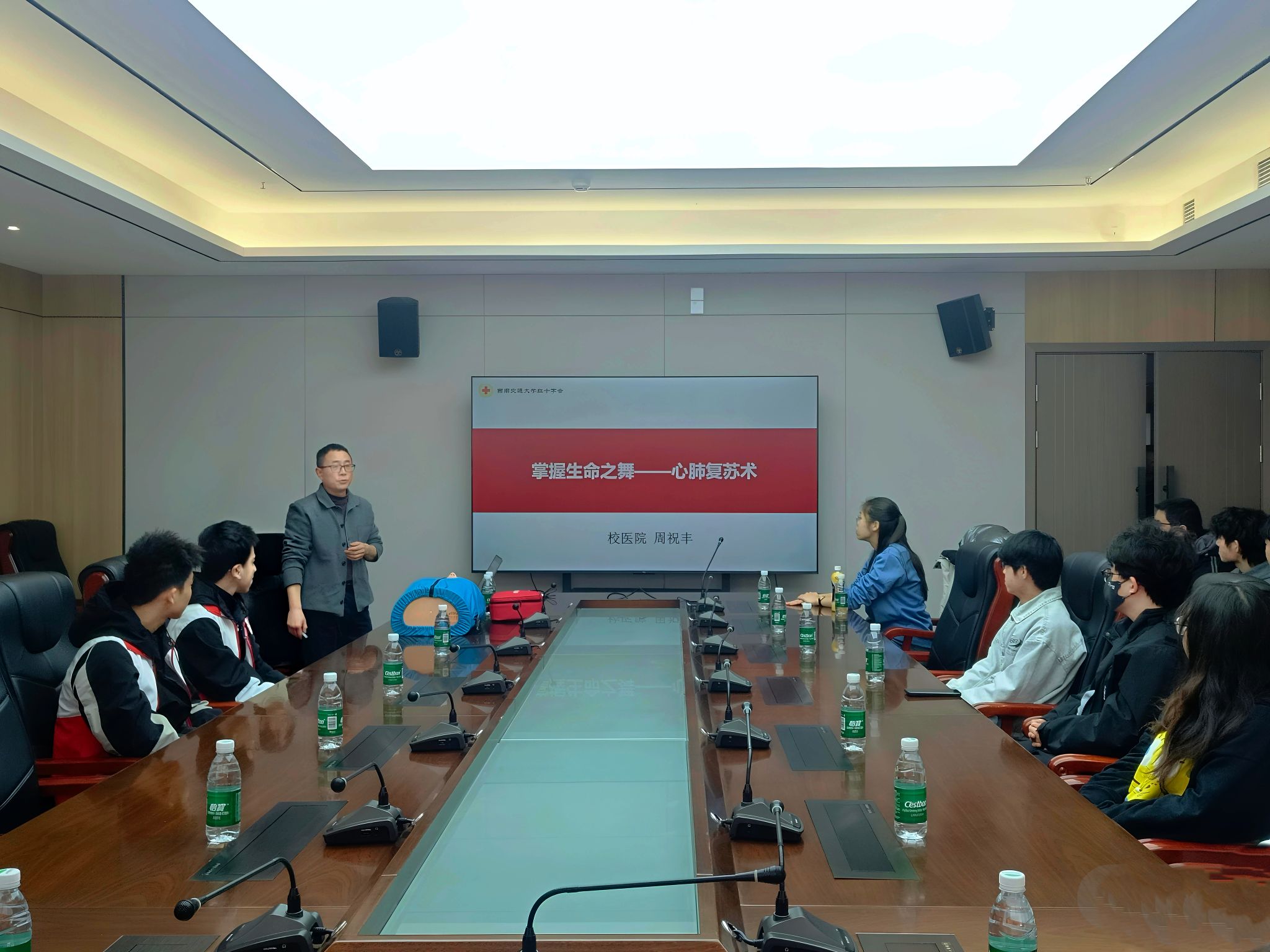 校医院副院长周祝丰老师作专题讲座。周老师以“掌握生命之舞——心肺复苏术”为题,系统讲解了心肺复苏术(CPR)与自动体外除颤器(AED)的关键知识与操作流程。他着重强调了心脏骤停后“黄金4分钟”的重要性,并通过专业演示完整展现了从现场评估、胸外按压、人工呼吸到AED使用的“生命救援链”,为同学们构建起清晰、科学的理论框架。