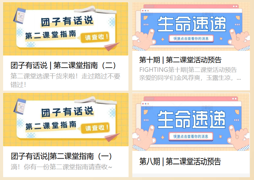 学籍管理规定中毕业等相关规定为起点,向同学们介绍了第二课堂成绩单制度在大学学习中的重要性。同时特别制作“团子有话说——第二课堂指南”系列推送,方便新生尽快了解第二课堂的重要性,提高对第二课堂的重视程度。