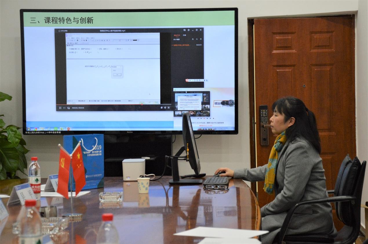 《物理化学B》的建设成果由郝静老师答辩展示。她着重展示了本课程在线上教学上的成果,向专家们展示了创新的线上教学互动流程。她提到“要将教书交给机器,老师则负责育人”。