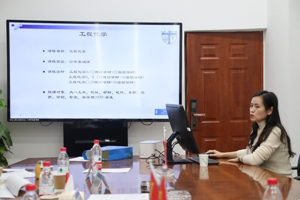 王萃娟老师代表《工程化学》建设组接受本次中期检查答辩。她在对课程及其目标进行介绍后,向专家们汇报了课程的建设情况和规划与展望。她着重向评委展示了“3-1-X”闭环式教学模式,获得专家们的肯定。