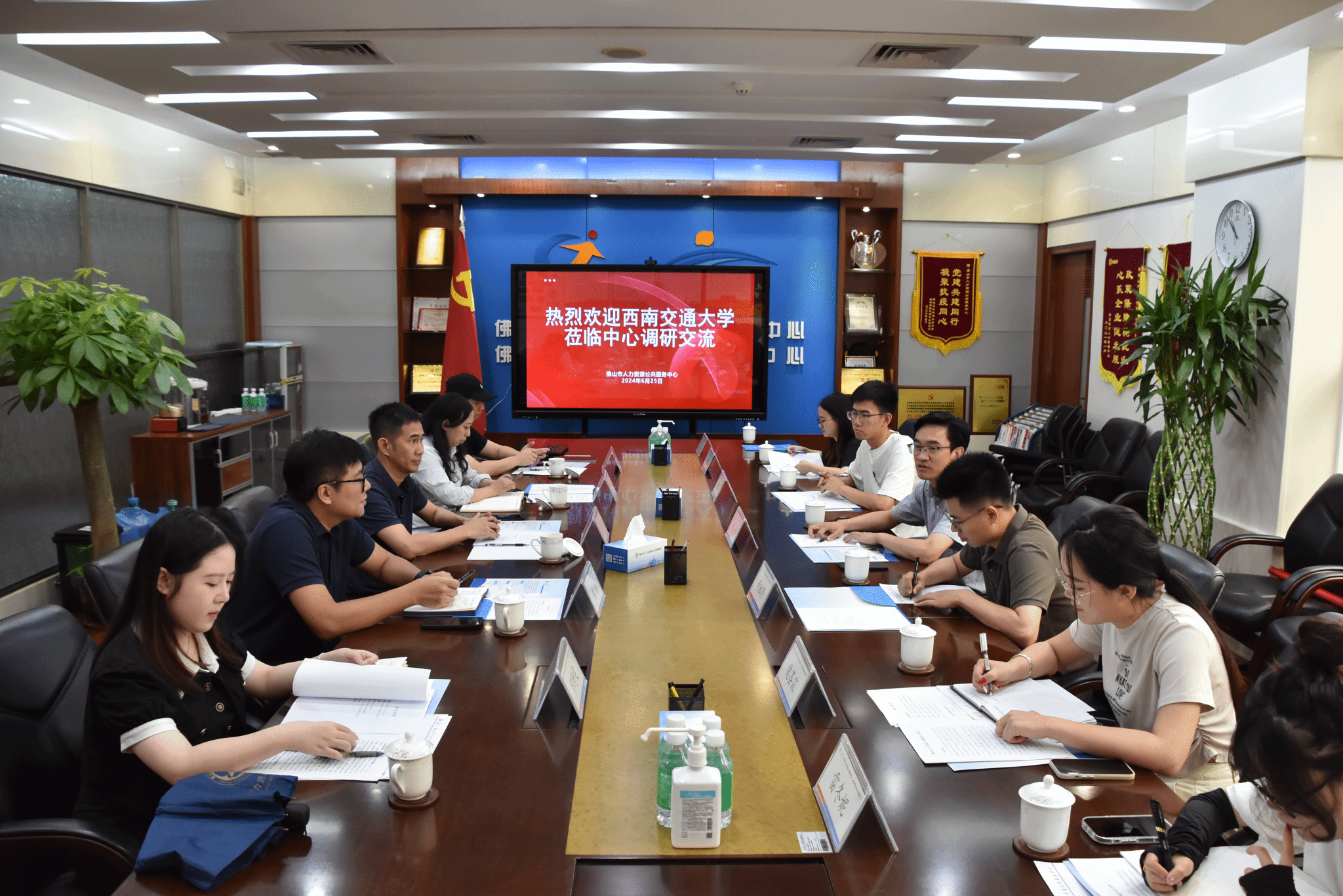 6月25日上午,学院师生来到佛山市人力资源公共服务中心,在中心副主任王强、人力资源市场部部长陈洪、副部长梁进宇等人的陪同下参观了公共服务大厅,并进行了座谈交流。王强副主任详细介绍了佛山市“一市五区”智能化人力资源市场的运行情况,公共就业服务和智能化招聘的“佛山经验”,以及佛山市人才引育政策、人才服务模式。朱炜副书记就成人直播