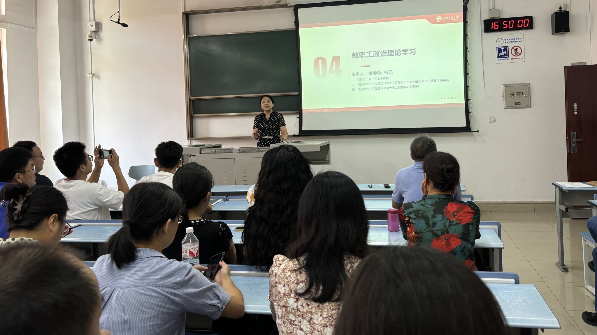 黄春蓉书记领学教职工政治理论学习内容。一是学习党的二十届三中全会精神,深刻认识党的二十届三中全会精神的重大政治意义、理论意义、实践意义,推动全会精神入脑入心。二是学习习近平总书记在纪念邓小平同志诞辰120周年座谈会上的重要讲话精神,深切缅怀邓小平同志的丰功伟绩,传承弘扬邓小平同志的光辉思想和崇高革命风范。三是学习习近平总书记在全国教育大会上的重要讲话精神,勉励全体教职工砥砺奋进,奋力扛起新时代建设教育强国的使命担当。黄春蓉还传达了学校相关会议精神。