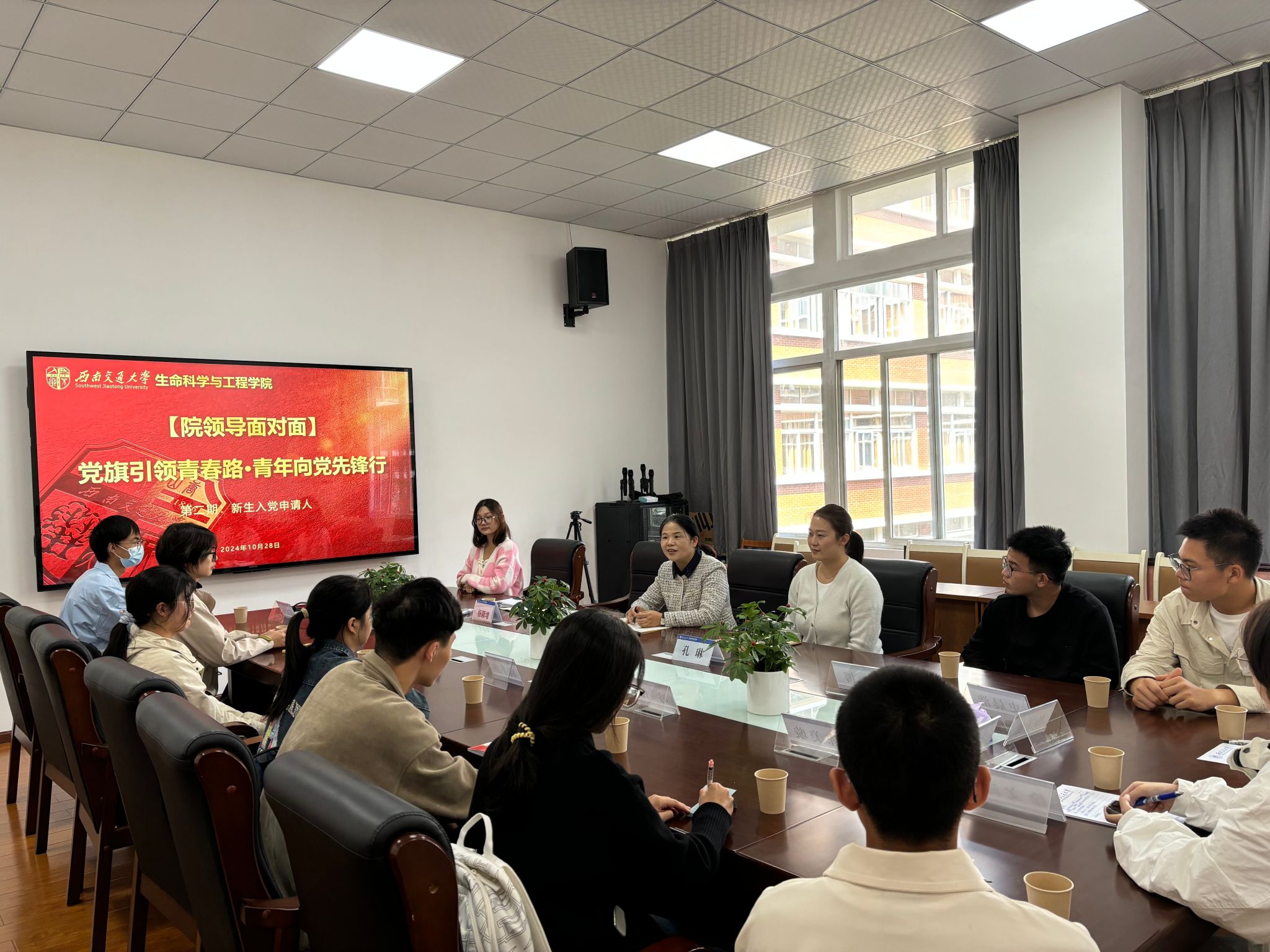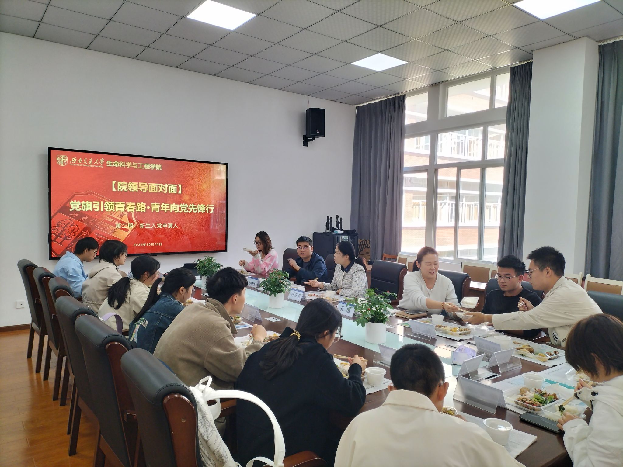 10月28日中午,“党旗引领青春路·青年向党先锋行” 院领导午餐会在犀浦校区X2314会议室举办,本次午餐会的主题是聚焦入党动机和入党流程。学院党委书记黄春蓉、专职组织员孔琳和本科生党支部递交入党申请书的部分新生代表参加了本次活动。学院为参会学生们精心准备了美味的午餐,午餐会现场以轻松开放的方式开展交流分享。