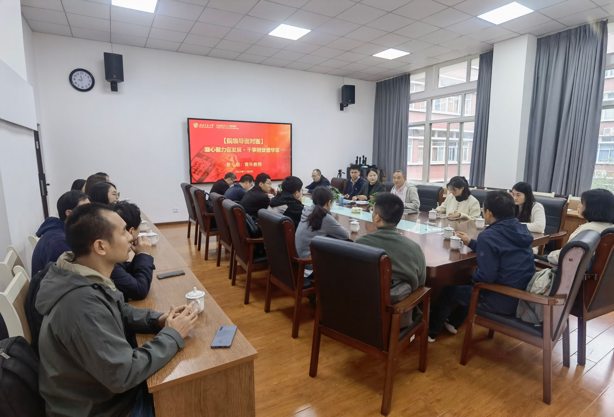第三期“院领导面对面”活动在犀浦X2314会议室举行,出席本次面对面活动的院领导是院长周先礼和党委书记黄春蓉。本期活动以“凝心聚力促发展,干事创业谱华章”为主题,参加交流活动的是学院20余名青年教师。