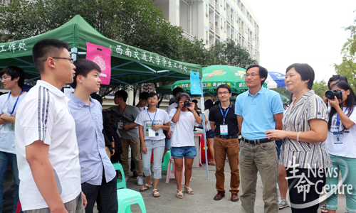 上午10:00,校党委书记顾利亚,学生工作处处长桂富强来到迎新点,询问了迎新点的工作情况,并与两名13级新生志愿者交流,详细询问他们报到情况。另外,顾利亚书记还就学院迎新人员的工作给予肯定和表扬。