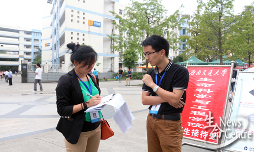 新生接待处,迎新工作人员耐心指导新生填写登记信息,为学生家长端水,并与新生和家长进行交流,耐心解答他们对学校、对学院的各种疑问和遇到的问题。学院还为新生专门准备了《交大宝典》,里面详细罗列了新生的报到注册流程、新生须知以及学院情况介绍、常用电话等。新生和家长都纷纷对迎新工作人员表示感谢。13级辅导员高鹏老师不离迎新现场,指导迎新工作。