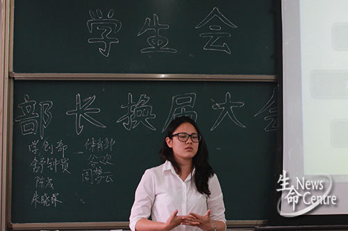 14届学生会主席郑涵丰,副主席许维嘉、张木及学生会各部门部长。本次会议由郑涵丰主持。