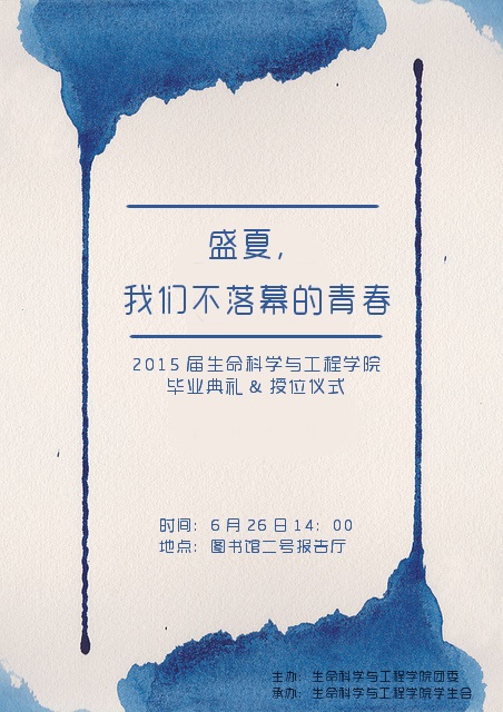 2015届毕业典礼暨学位授予仪式 “盛夏,我们不落幕的青春”毕业典礼,将于6月26日(本周五)14:00在犀浦校区图书馆二号报告厅隆重举行。