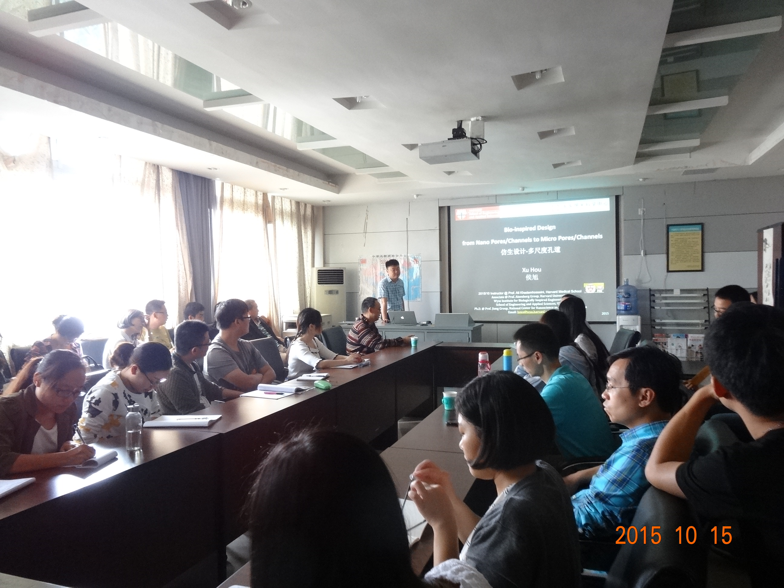 10月15日上午9:00,研究生“创源大讲堂”学术讲座在学院3609会议室如期举行,院长周先礼、及部分老师参加了讲座,同学们踊跃参加,会议室座无虚席。本次“创源大讲堂”邀请到了哈佛大学医学院的候旭博士为我院研究生做题为“仿生多尺度孔道材料”的学术讲座。候旭博士担任SCI杂志Journal of Nanomaterials的客座编辑及Adv. Mater.,Electrochem. Comm.等十多个SCI学术期刊的审稿人。发表27篇SCI学术论文和1本学术专著,总影响因子大于320。相关研究工作受到科学界广泛关注,先后被Nature杂志和Nature China网站highlight。