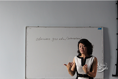 首先,Peace Li结合2013级中美班在GSU的学习情况,针对2014级学生可能面临的问题进行了讲解,同时对GSU进行了全面而细致的介绍,包括:校园基础设施、地理环境、学费和奖学金情况,并列出GSU的优势专业排名。