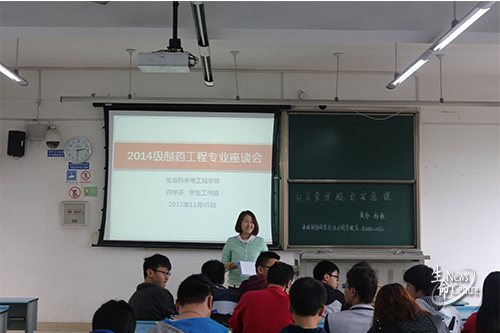 会议开始,闫智勇教授就制药工程专业方向,就业方向,培养计划等方面给2014级制药专业的同学们进行了详细地介绍。制药工程专业方向分为化学制药和中药制药,本科专业毕业生就业率稳居全国本科毕业生就业榜前茅。