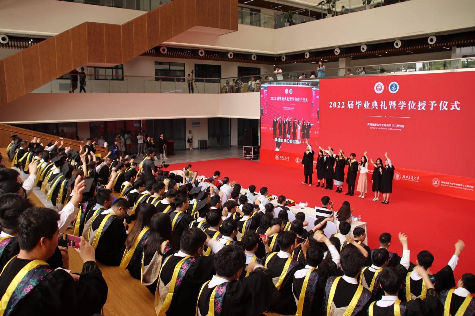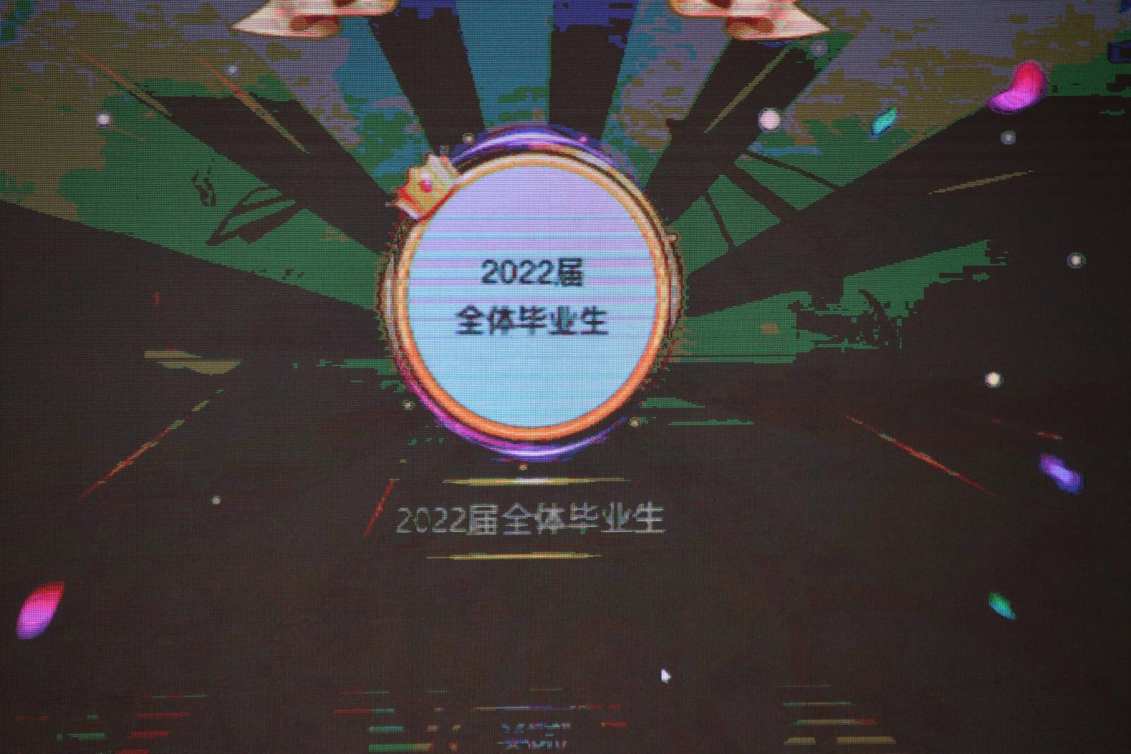 2022届全体毕业生”,全场响起热烈的欢呼声,老师和同学们纷纷为毕业生送上祝福,现场掌声雷动。