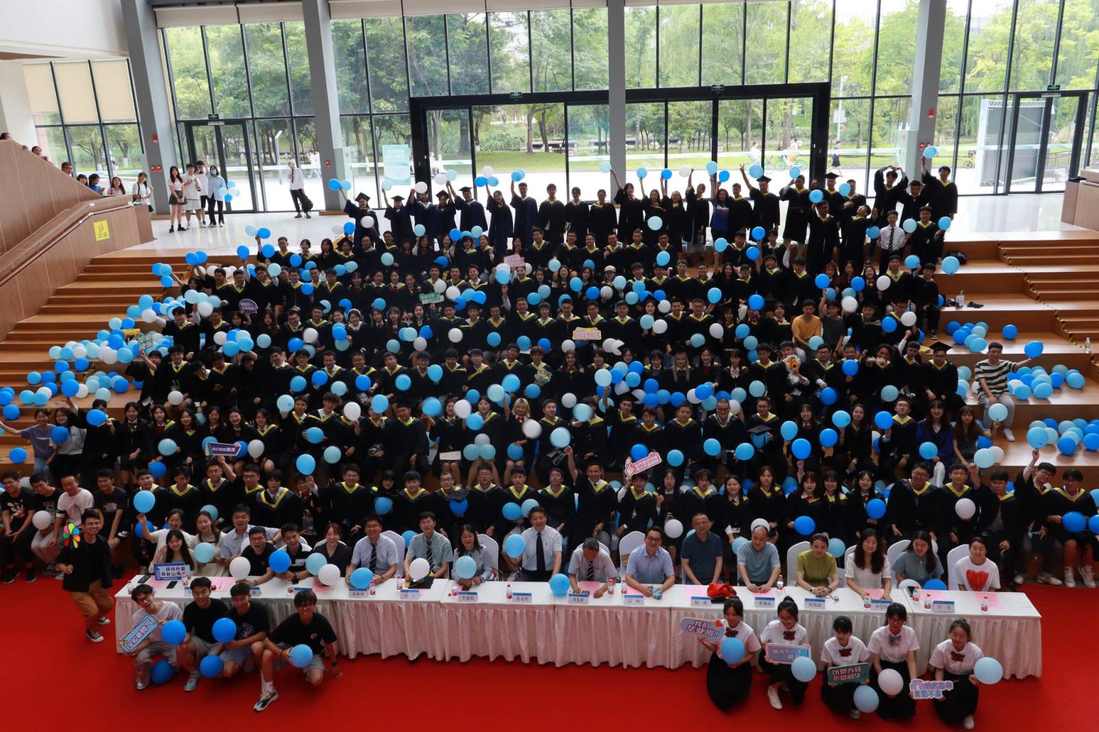 仪式尾声,辅导员胡慧怡和毕业生代表精心准备了歌曲快闪。《入海》、《记念》、《如愿》、《有我》等歌曲寄托了老师和同学们的美好期望和祝福,现场气氛欢快热烈。快闪环节的最后,全体毕业生齐唱《不说再见》,既向过往的校园生活说再见,又饱含对同学情谊、师生情谊、校友情谊的铭记与珍藏。随着一声“毕业快乐”,几百个气球从天而落,将典礼推向高潮,授位典礼圆满结束。