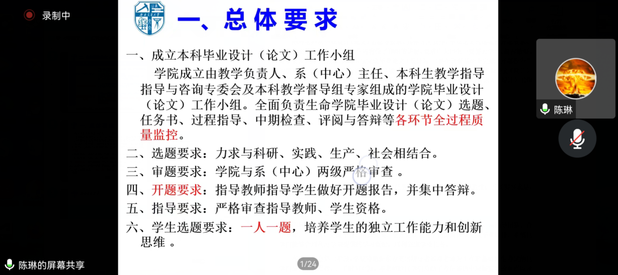 院长助理陈琳老师强调了毕业论文的重要性,希望同学们高度重视,严格按照学院毕业论文(设计)的相关文件要求和时间节点做好相关工作,希望同学们坚守诚信,树立正确的学习观、价值观,协调好论文和就业的关系,认真对待毕业论文工作,及时、主动地与指导老师联系,保质保量地做好毕业论文(设计)。