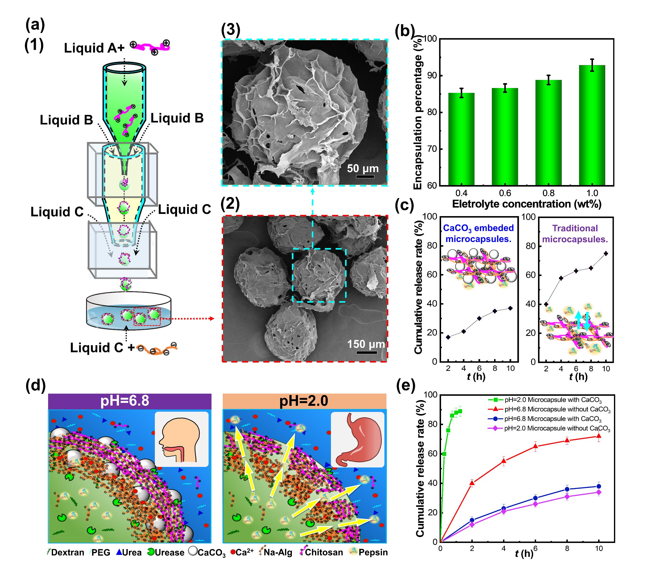 在自然界中,细胞通过隔室化富集生物分子并控制关键分子进出以进行高效催化及有序生化反应。模拟细胞隔室,在水相环境中可构建全水生物隔室,并由于其具有高生物相容性及与细胞环境高相似度,已被广泛应用于药物递送、探索细胞反应机制等领域。然而全水生物隔室界面张力低,难以稳定。即使目前已有特定颗粒可吸附在界面以稳定全水隔室,但由于界面吸附过程具有随机性并受局部环境流体性质影响,导致产生的全水隔室界面性质不可控,影响全水隔室对生物分子的包封与递送。受细菌通过尿素分解通路在其自身表面形成碳酸钙颗粒的启发,并基于本课题组近年来在全水相界面生物反应及功能材料创制(AIB)方向的工作积累(Chemical Engineering Journal, 2023, 454, 140276; ACS Applied Materials & Interfaces, 2022, 14(4), 5009-5016; Bioresource Technology, 2021, 342, 126019; ACS Applied Materials & Interfaces, 2019, 11(40), 37313-37321; Chemical Engineering Journal, 2018, 335: 392-400; ACS Macro Letters, 2017, 6(7): 679-683.),作者提出在全水隔室界面原位仿生矿化产生碳酸钙颗粒,以长时间稳定全水隔室。通过在界面原位形成碳酸钙颗粒,避免了颗粒随机吸附并不受局部流体环境干扰,实现了全水隔室性质的有效调控,稳定时间可达无碳酸钙颗粒覆盖的全水隔室的90倍(图1)。并且,以此全水隔室为模板制备的药物递送体系提供了酸响应性,可在胃部环境实现生物药物快速释放,用于治疗消化功能紊乱等相关疾病(图2)。此研究为全水隔室制备提供了通用且可控的策略,为生物药物保存与递送提供全新平台;通过将水性两相系统与生物矿化结合,开辟了通往下一代自组装材料和结构的新途径。据悉,该研究成果正与生物技术企业开展成果转化,共同推进其在药物递送领域的应用。
