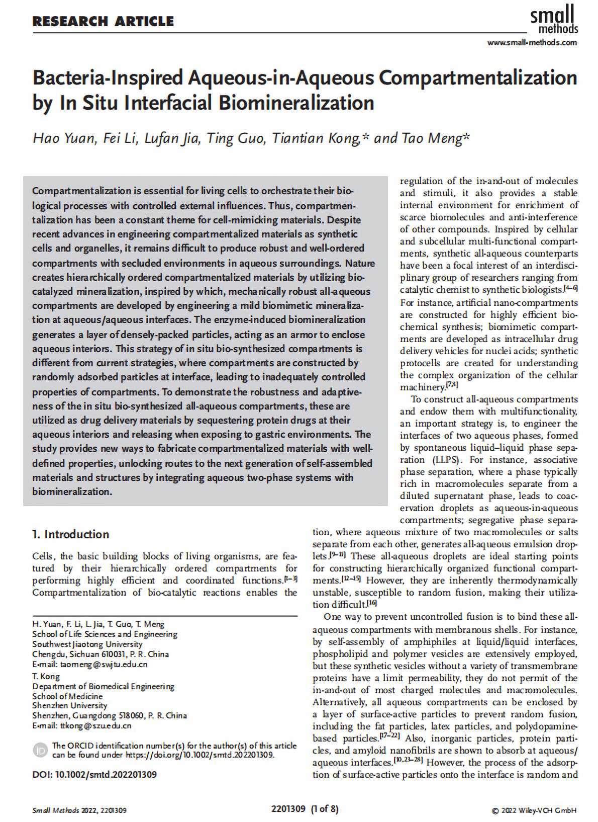 近日,国际生物医学、化学、物理学和材料学领域权威期刊《Small Methods》(影响因子15.367)报道了我校“微纳生物技术”创新团队孟涛教授的研究成果“Bacteria-Inspired Aqueous-in-Aqueous Compartmentalization by In Situ Interfacial Biomineralization”中文译名:“受细菌启发的全水隔室界面原位仿生矿化”(DOI: 10.1002/smtd.202201309)。论文第一作者为成人直播 苑昊老师和2018级硕士研究生李飞,通讯作者为深圳大学生物医学工程学院孔湉湉副教授和成人直播 成人直播 孟涛教授,成人直播 为第一署名单位。